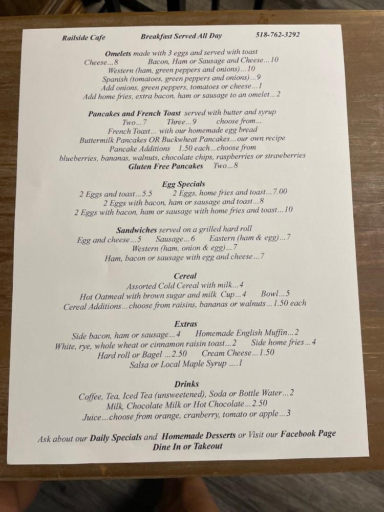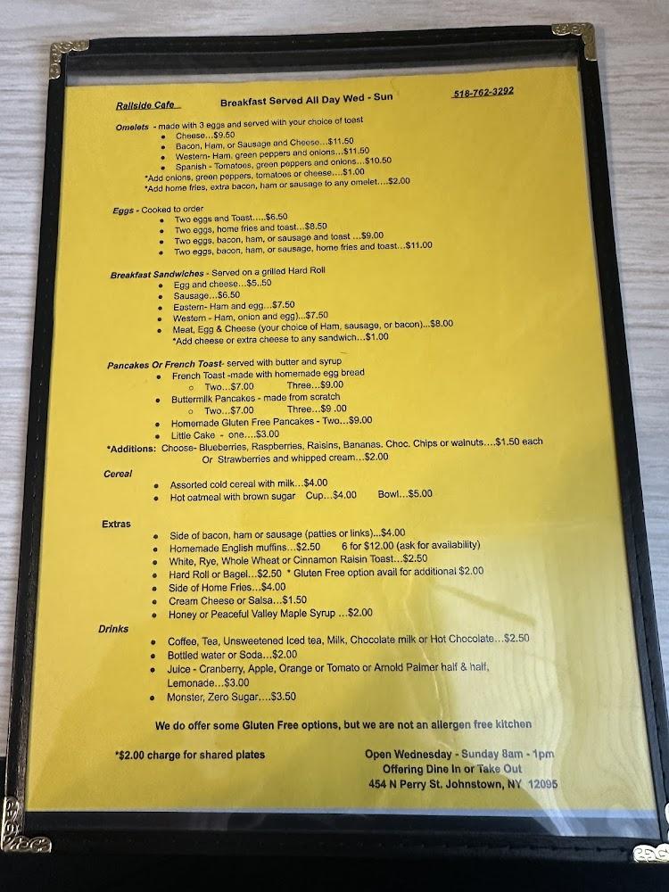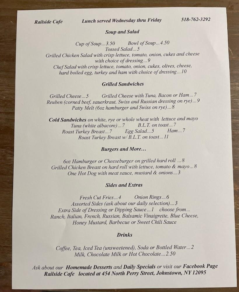 Welcome to Railside Cafe, your go-to diner located at 454 N Perry St, Johnstown, NY. With a charming ambiance and a menu brimming with traditional breakfast, brunch, and lunch options, we pride ourselves on offering the finest local specialties and exceptional desserts. Enjoy your meal on our inviting terrace or take advantage of our quick service for takeout and delivery. Our cafe is family-friendly and fully accessible, ensuring everyone can enjoy a delightful experience. With a great selection of coffees and teas, we’re perfect for solo diners and groups alike. Visit us today for a satisfying meal in a relaxed setting!